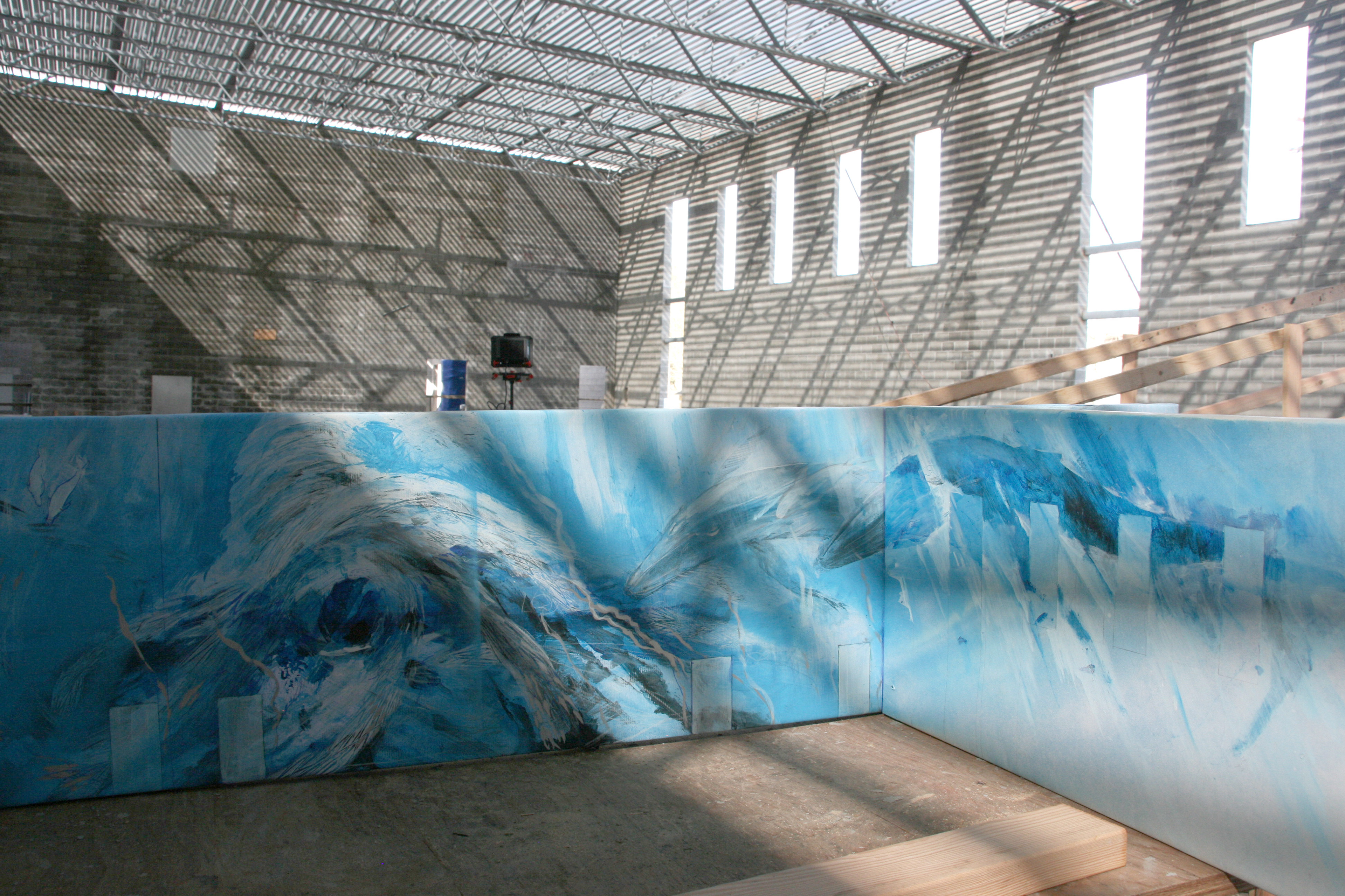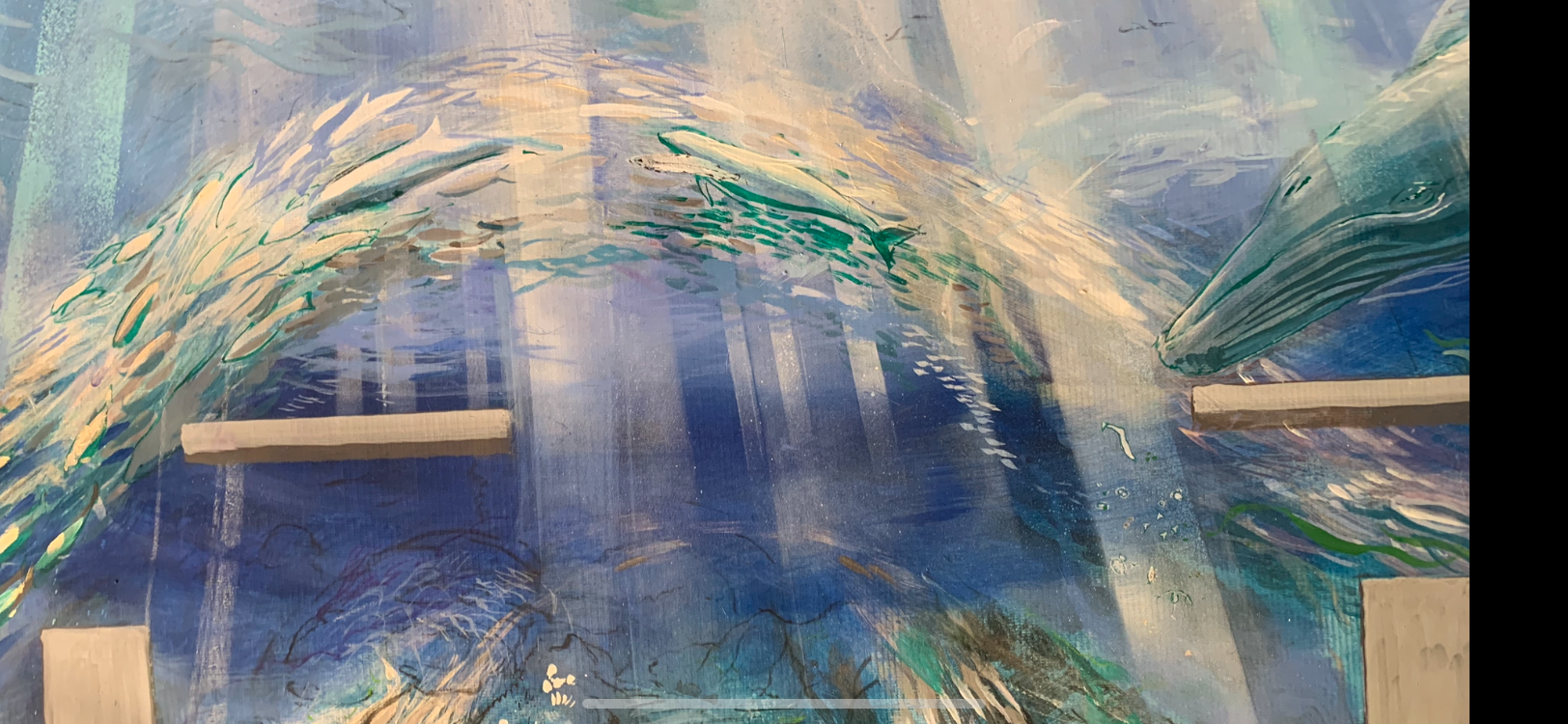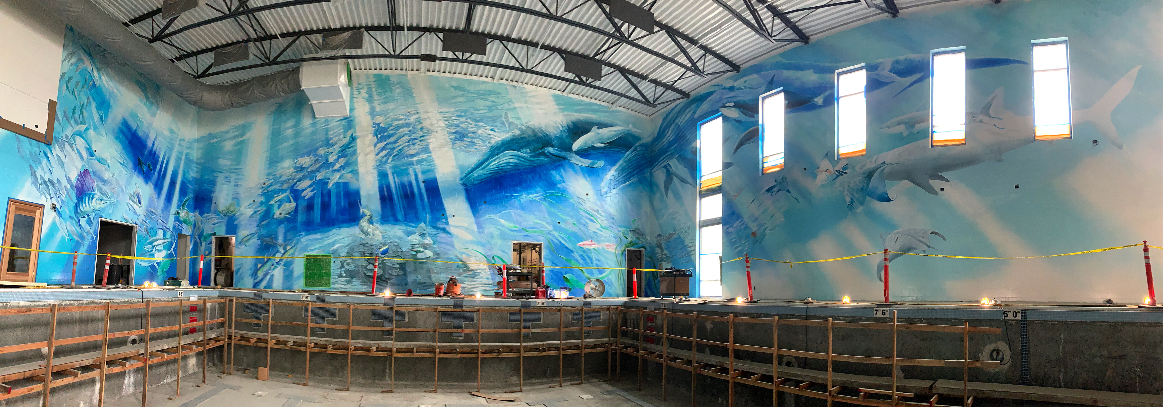 The muralist, Esteban Camacho Steffensen, created an immersive work of art to offer swimmers a chance to submerse themselves in images of marine life and the ancient rhythms of the ocean, where life began. It depicts life-sized, swimming whales, fish, sea turtles and other symbolic marine species, and invites you to swim with them. They are here to inspire us to be a good stewards of both our own bodies, and the natural world, our home.