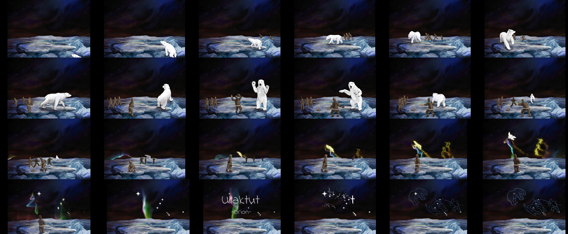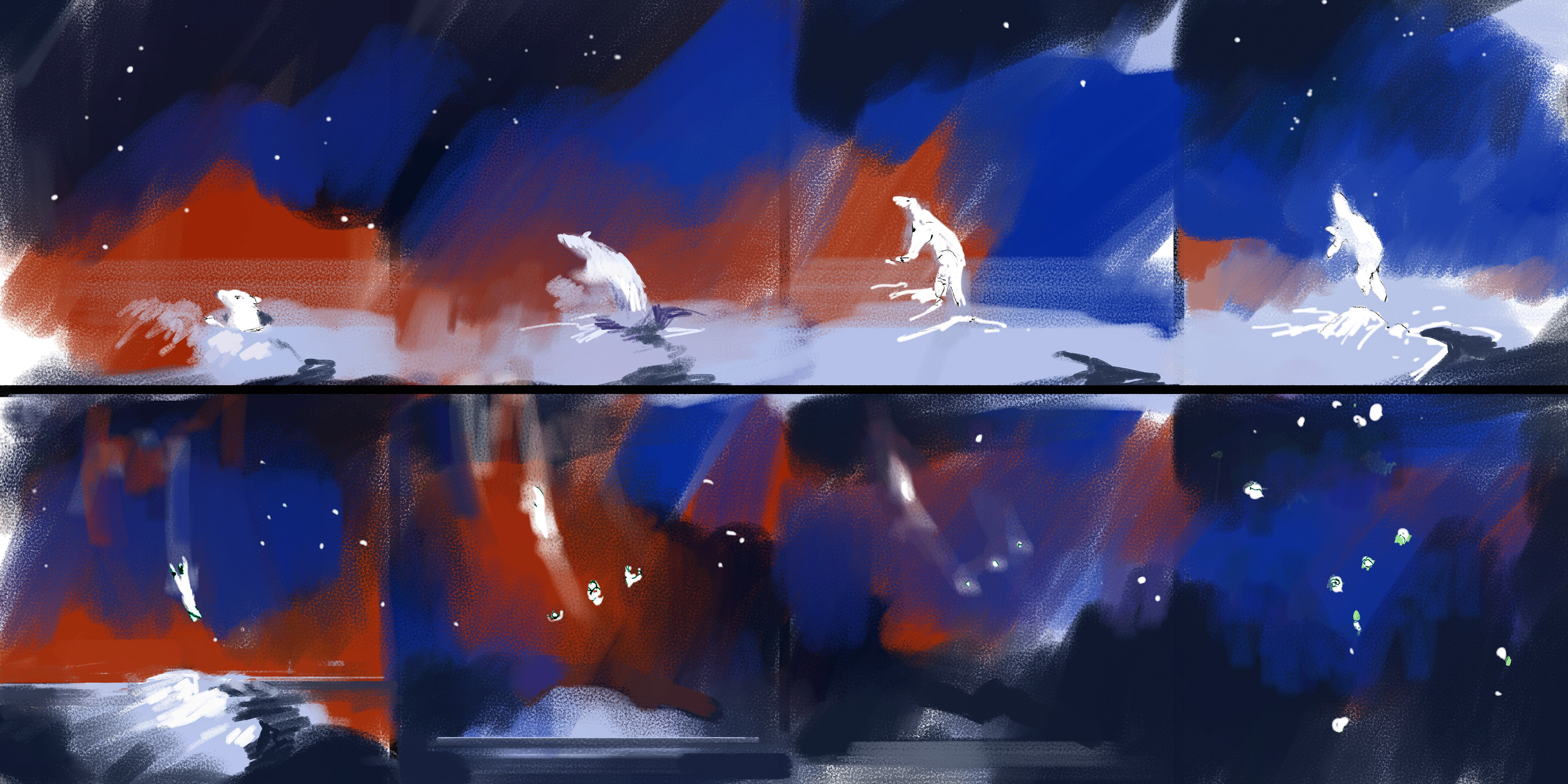 For the drawing process we included hand-drawn sketches and used variety of drawing software including Adobe Photoshop, Corel painter, and Autodesk Sketchbook Pro. The animation of the still frames was imported into Adobe Premiere, After Effects, and Unity. Various particle and light effects were implemented in Unity for the final project.