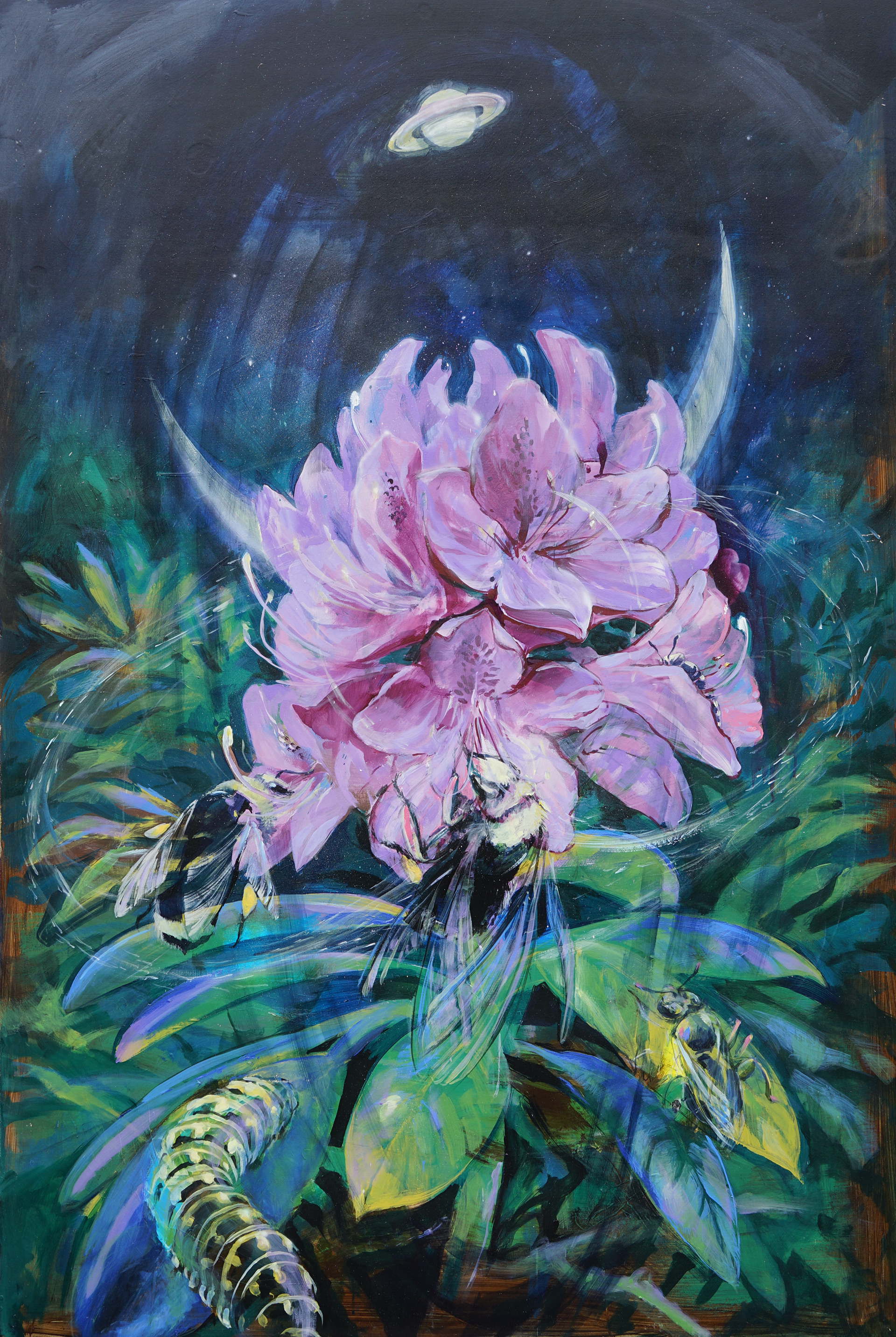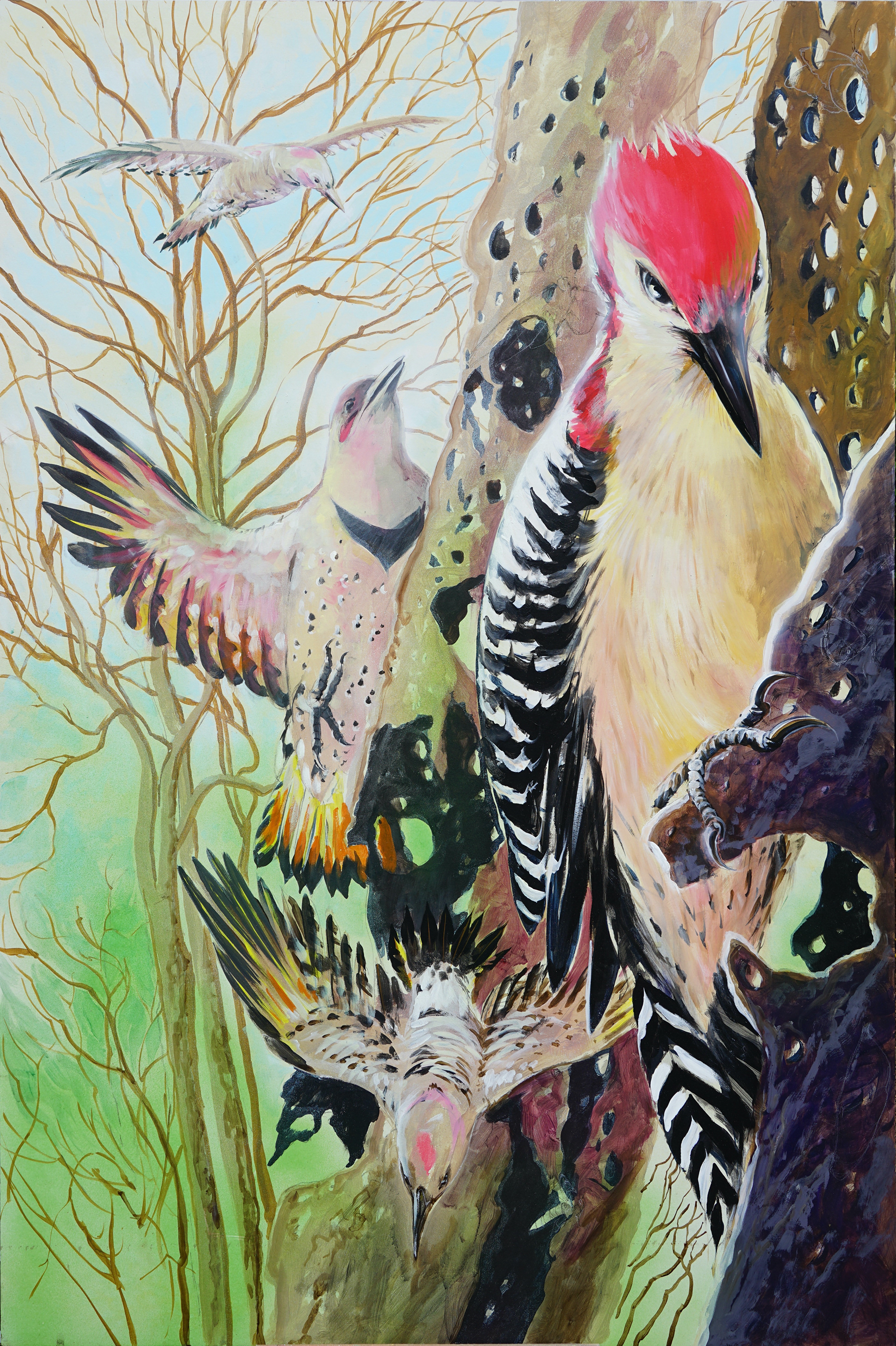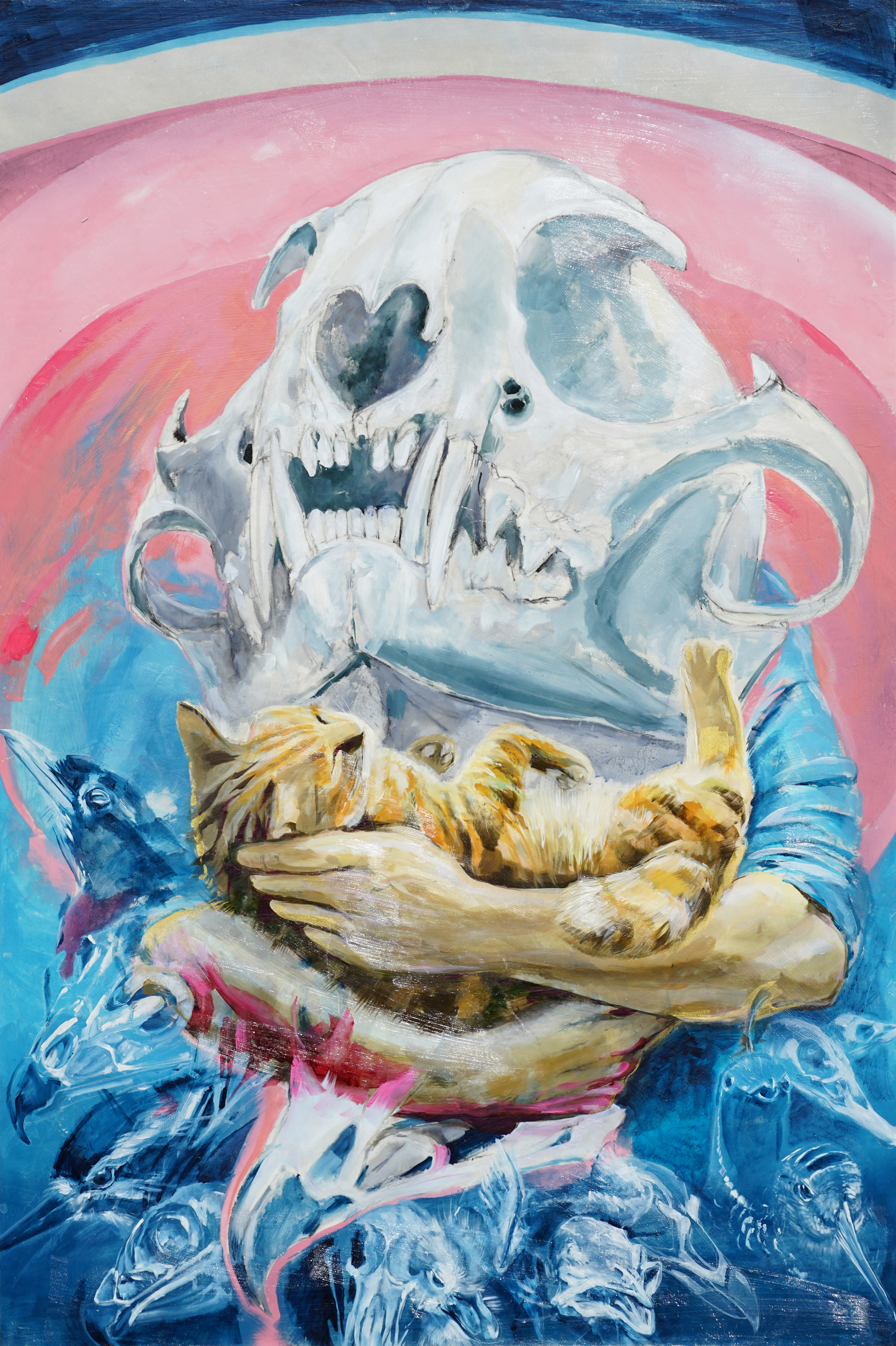 Despite the unusual imagery, this painting is about the affection and the responsibility we have for our domesticated pets, cats in particular; and the negative impact they can have on wild species. Cuddly, orange, tabby cats are commonly seen in almost every city in the Pacific Northwest. Yet these cats are also the primary predators of many bird species, which are now becoming endangered. Our love and admiration of other species is an essential part of our humanity. But one of the hard truths about love, is that to concentrate our love in one place is to not give it elsewhere. No one would deny the important role that house cats can play in our sense of home, but that does not relieve of us of the responsibility towards the other wild species that are native to the region. The humble song sparrow and small birds whose ghost are depicted here as the many victims of our pets also deserve respect, care and protection.